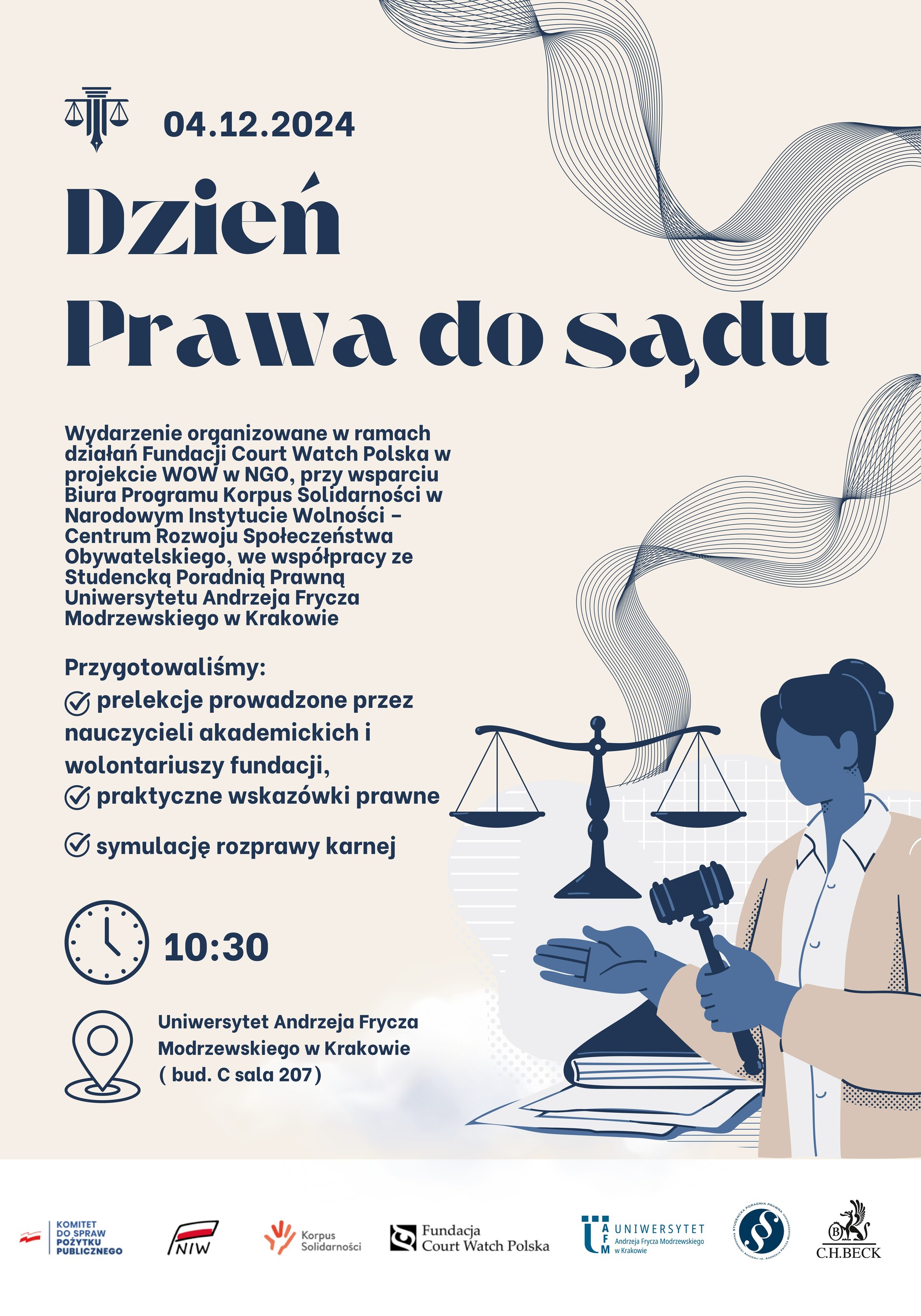 Wydarzenie organizowane przez Studencką Poradnię Prawną Uniwersytetu Andrzeja Frycza Modrzewskiego w Krakowie i Wolontariuszy Fundacji Court Watch Polska, w ramach działań Fundacji Court Watch Polska w projekcie WOW w NGO, przy wsparciu Biura Programu Korpus Solidarności w Narodowym Instytucie Wolności – Centrum Rozwoju Społeczeństwa Obywatelskiego.