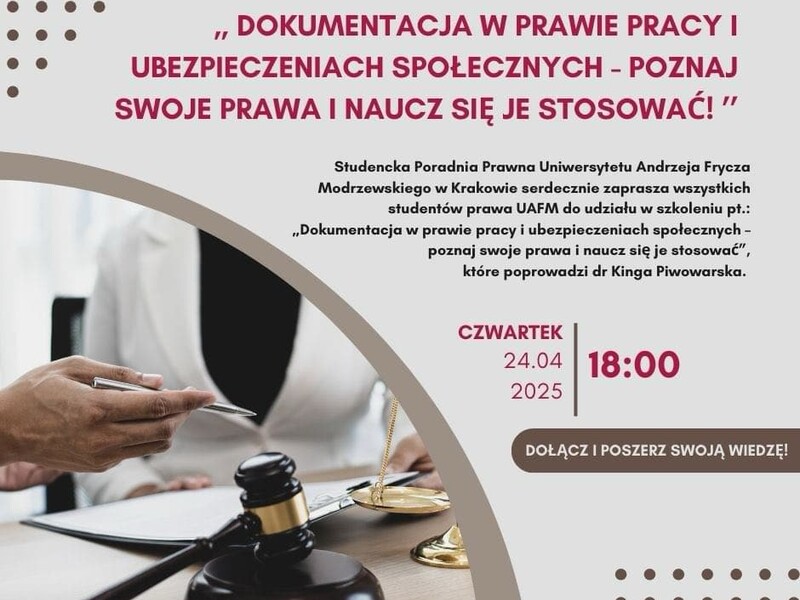 Zaproszenie na szkolenie “Dokumentacja w sprawach z zakresu prawa pracy i ubezpieczeń społecznych. Czy znasz swoje prawa i wiesz, jak je stosować?” - 24 kwietnia 2025r.
